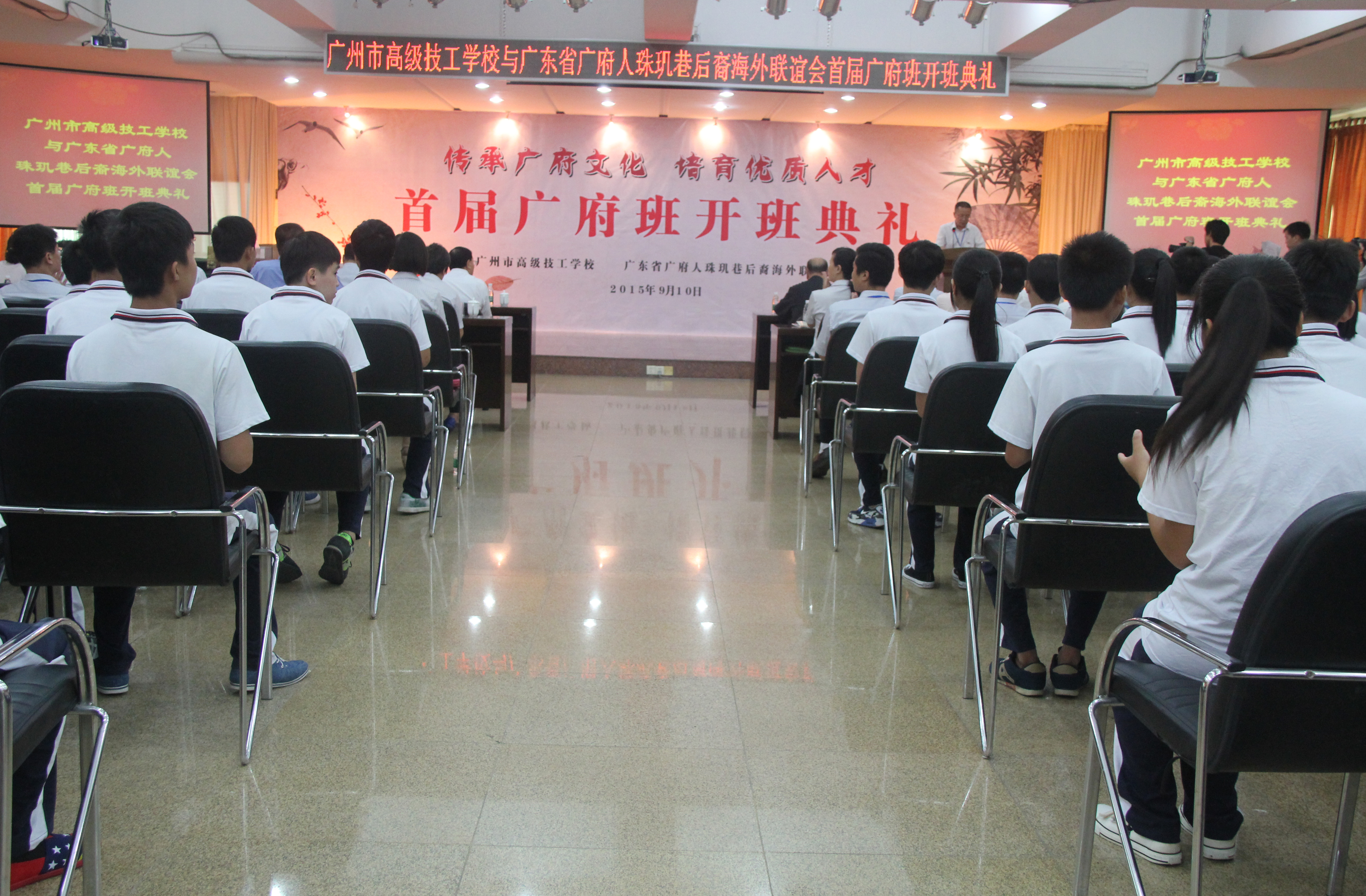 广府班是我校携手广府人联谊会公益性质的高技能人才培养模式探索。今年1月23日广府人联谊会与广州市高技签约合作办学协议,协定从2015年起,用5年时间,双方共同培养不少于200名广府人后裔高技能人才。招生对象为家庭困难的广府人后裔初中毕业生。学制为3年。广府班学生在校期间,除享受国家、省、市免学费及奖、助学金政策外,还享受广府人联谊会免费提供的所有学杂费资助,并享受每月500元生活费补贴、以及学校和广府人联谊会共同定制的优质教育教学服务。