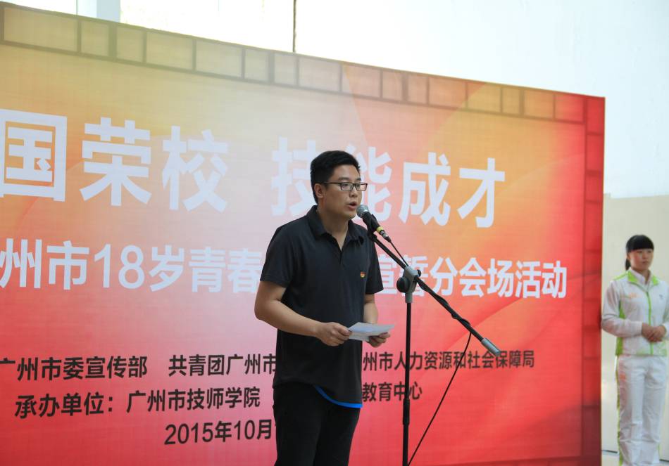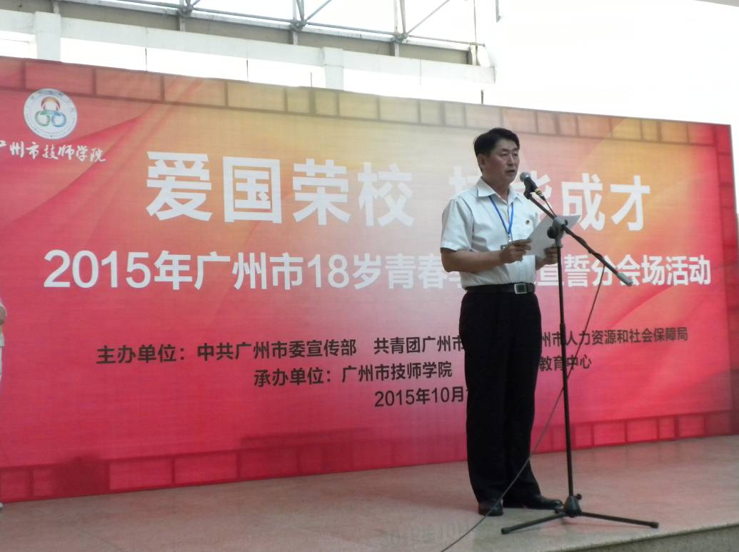 继我校去年成功举办全市成人宣誓主会场活动后,2015年10月18日下午3时,由中共广州市委宣传部、共青团广州市委员会、广州市人力资源和社会保障局团委联合主办,我校与广州市国防教育中心共同承办的2015市成人宣誓分会场活动在市国防教育中心举行。市委宣传部宣传处陈立春副处长、市人社局团委许俊峰副书记、市技师学院党委张恩思书记、市国防教育中心岳玉生主任以及beat365正版唯一官网必一先进和汽车系的18岁青年学生代表共计200多人参加了活动。