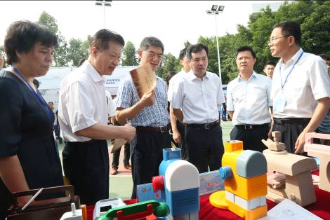 ▲闭幕式展示活动中,人社部职业能力建设司司长张立新(右三)等领导莅临原型制作项目展位观摩