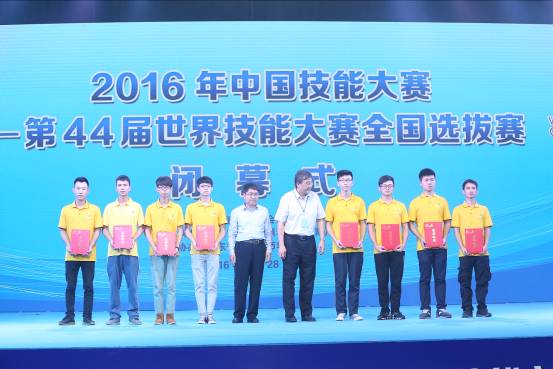 ▲第44届世界技能大赛全国选拔赛原型制作项目冠军黄枫杰(左二)在闭幕式上领奖