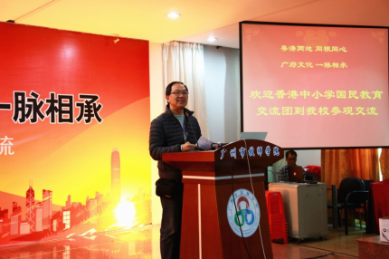 11月26日,由香港教育局、省港澳同胞接待办公室、香港教育工作者联合会主办,团省委、团市委协办的“薪火相传”之“同根同心”香港中小学生国民教育计划活动交流团走进我院。115名来自香港保良局唐乃勤初中书院的学生与我院广府班150名学生开展了一堂“粤港两地,同根同心;广府文化,一脉相承”的温馨而和睦的文化交流、分享课。