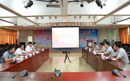 6月8日,湘西自治州人大常委会副主任石耀华,湘西自治州人社局党组成员、副局长贾非,湘西自治州人力资源管理服务中心主任杜芳松,湘西自治州慈善办副主任彭军等,在广州市人社局农民工工作处副处长韩庆旗的陪同下,前来我院参观交流,举行湘西自治州孤儿职业教育合作座谈会。双方就合作焦点、难点进行磋商。学院院长李宗国、副院长詹益全、招生就业处主任温志刚参加座谈。