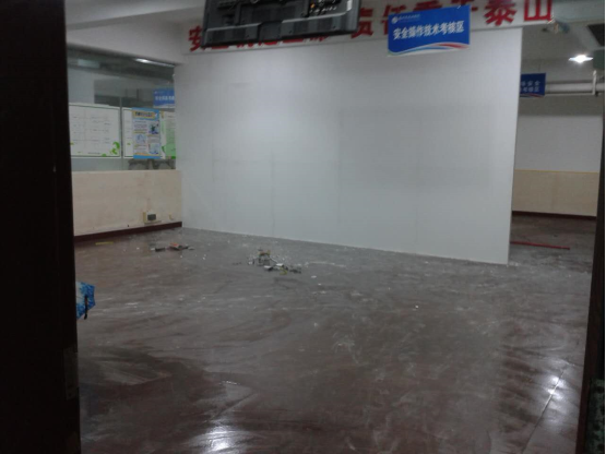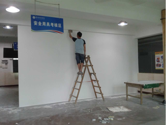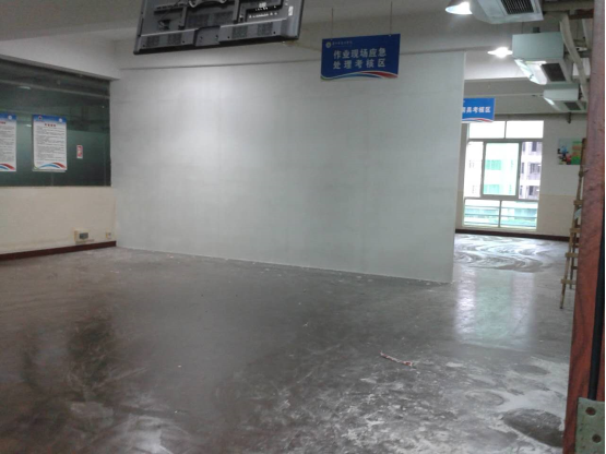 特种作业电工考场修缮中,考试内隔墙双板都已装好上胶,地面待再打磨再上漆