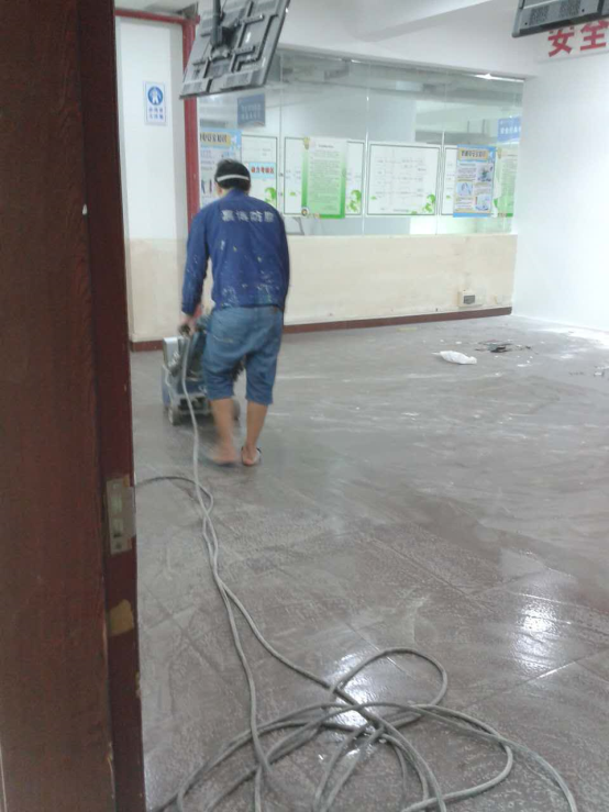 地坪漆师父在清扫底漆打磨后灰尘,准备刷地坪面漆