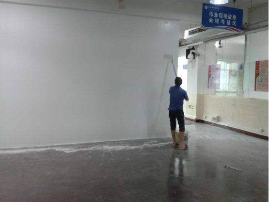 电工实训室修缮501室502室隔板墙地坪漆项目施工于7月5日晚上8时完工,空置两天待干固硬化。