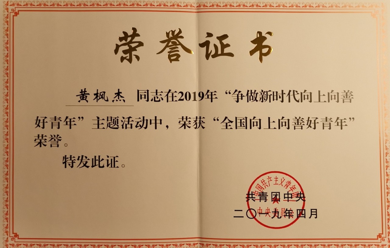 我院教师黄枫杰荣获2019年“全国向上向善好青年”荣誉