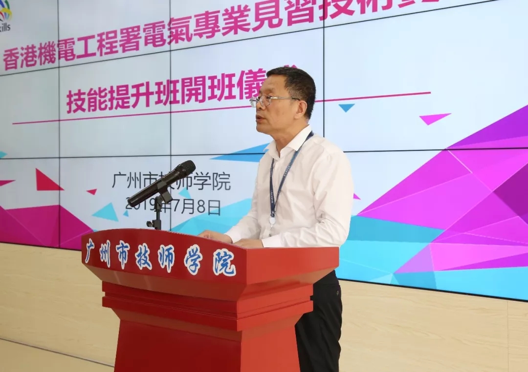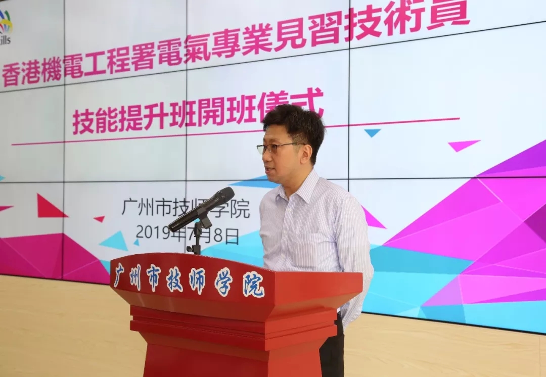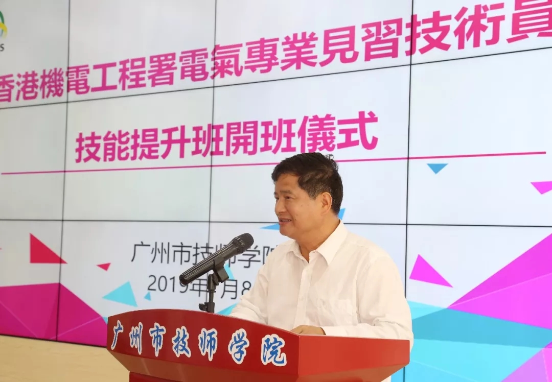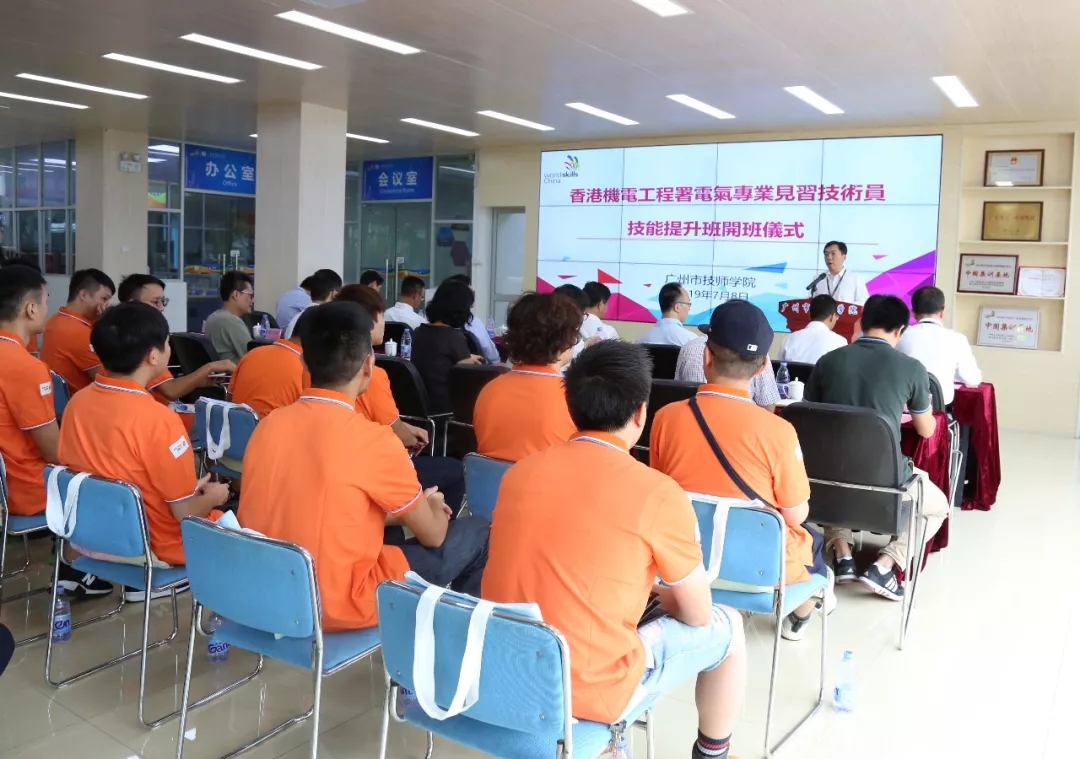 香港机电工程署高级工程师关嘉文、高级工程师黄建潭、工程师刘景富、助力电气督察庄意忠,广州市人力资源和社会保障局发展规划处处长范海强、职业能力建设处副处长肖海、技工教育管理处调研员胡悦光等出席。本次培训导师beat365正版唯一官网必一教师陈贤通和李炎波,以及来自香港的20名学员等参加开班仪式。