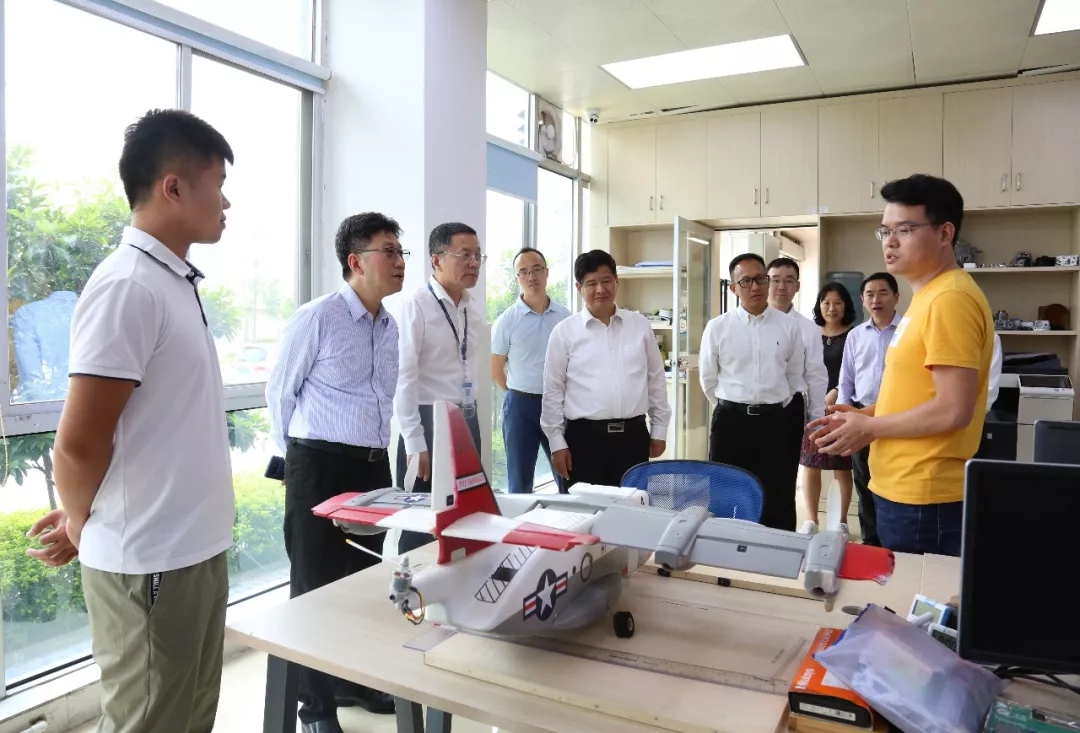 ▲省技术能手刘洋老师(右一)、第44届世界技能大赛CAD机械设计项目银牌选手陈启佳老师(左一)介绍无人机研发情况