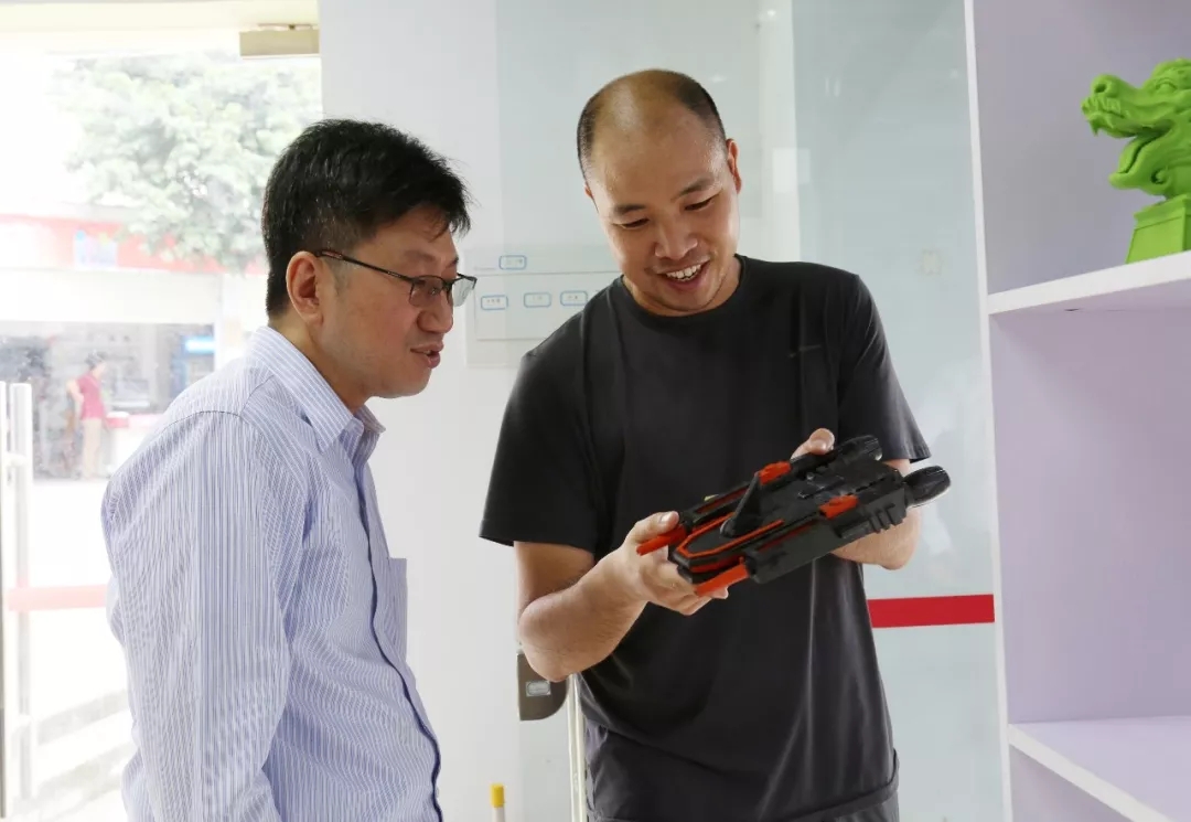 ▲朱沛欣老师(右)向张远芳助理署长介绍学生自行设计的3D打印作品太空飞船模型