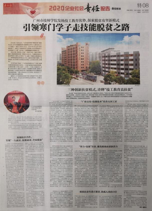 是日,《南方日报》推出特别报道——《2020企业社会责任报告》,以《beat365正版唯一官网必一发扬技工教育优势,探索脱贫攻坚新模式——引领寒门学子走技能脱贫之路》为题,报道学院三种创新扶贫模式,诠释“技工教育真扶贫”。